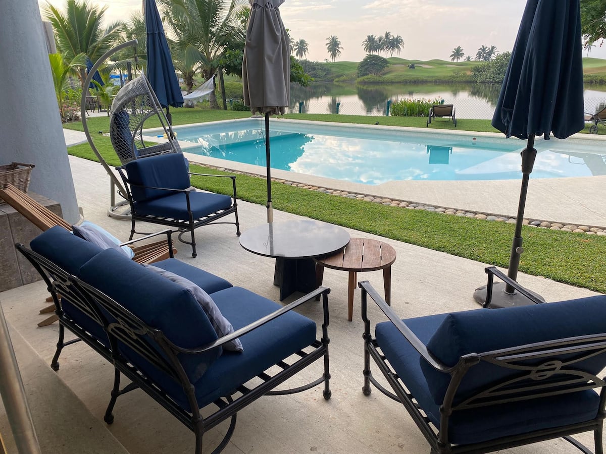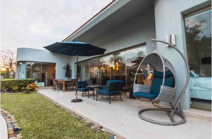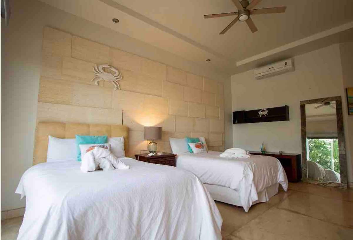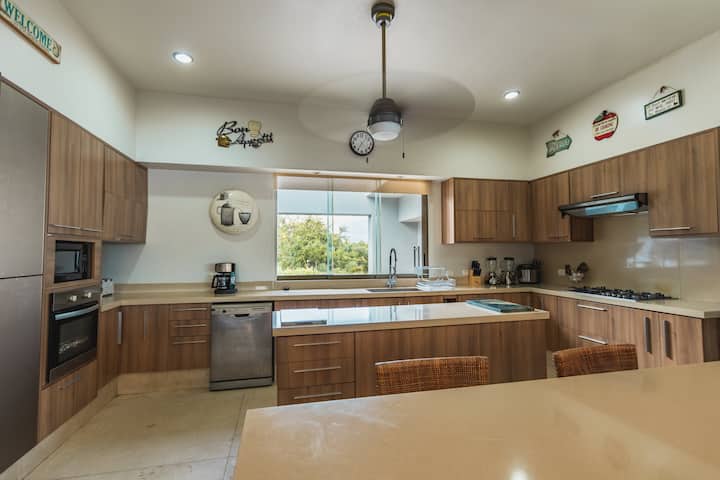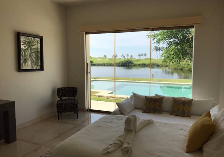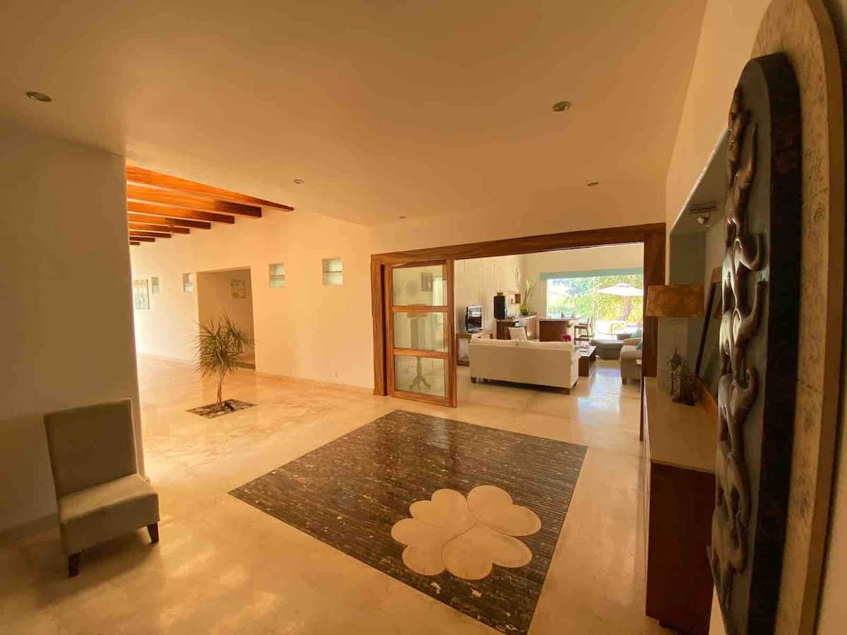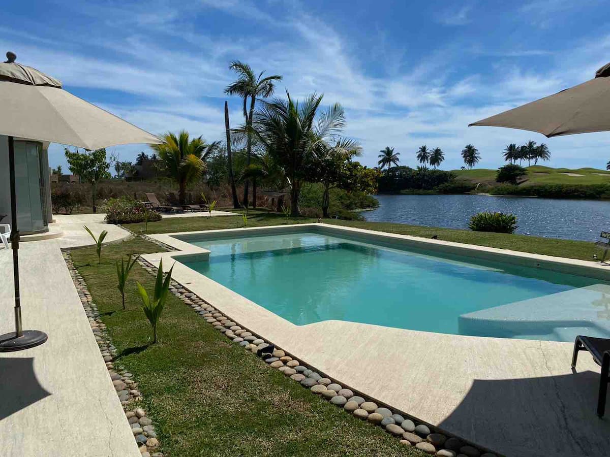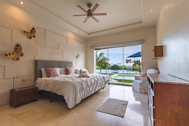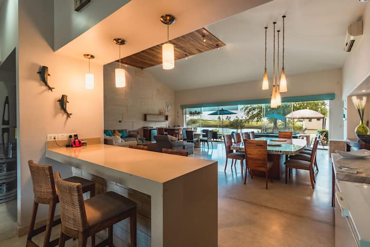 Es una exclusiva residencia de un solo nivel en un terreno de más de 2,000 m² con 1,200 m² de construcción, ideal para hasta 16 personas. Cuenta con alberca, amplias áreas exteriores y una atmósfera sofisticada y tranquila con vistas al lago y al campo de golf. Consta de 5 recámaras, sala de TV con cama adicional, y cada rincón está decorado con elegancia y comodidad. Ubicada en el fraccionamiento más exclusivo de la zona, ofrece seguridad, acceso al mar a pie en solo 10 minutos y espacios perfectos para ejercitarse al aire libre o correr en la playa. También incluye dos bicicletas para paseos. Se recomienda no acercarse ni alimentar a los reptiles del ecosistema local ni ingresar a los lagos interiores.