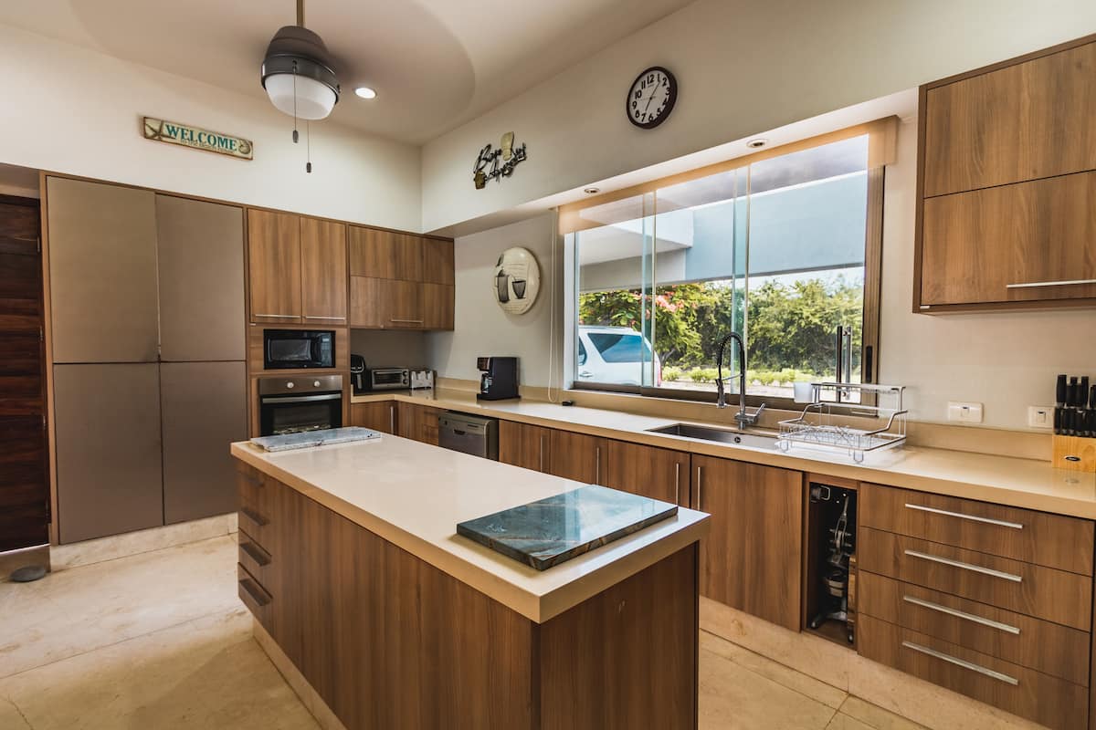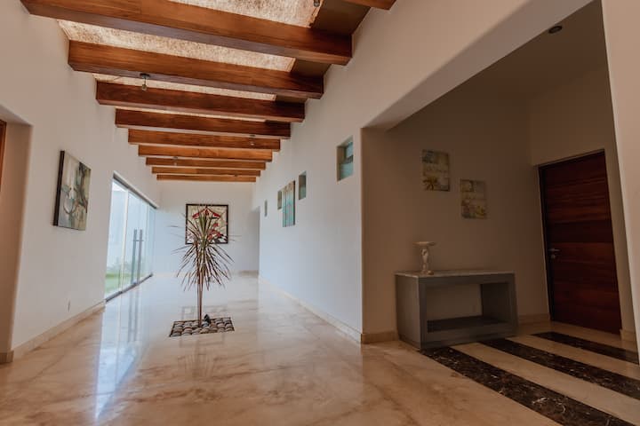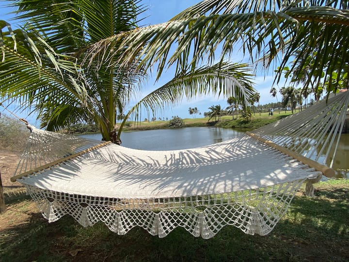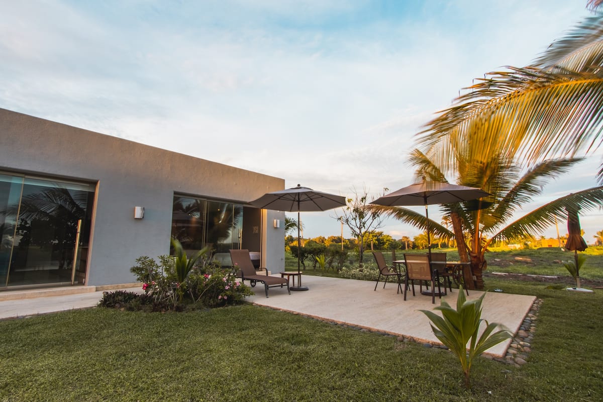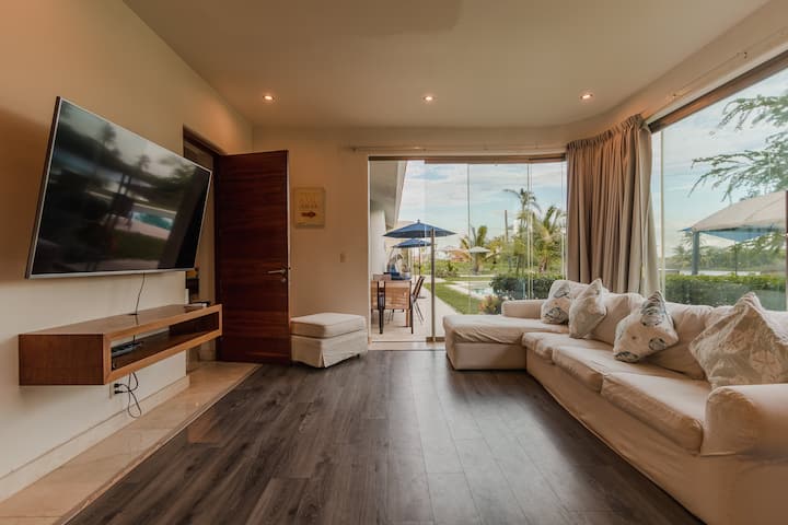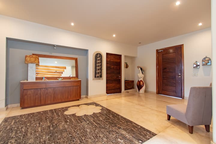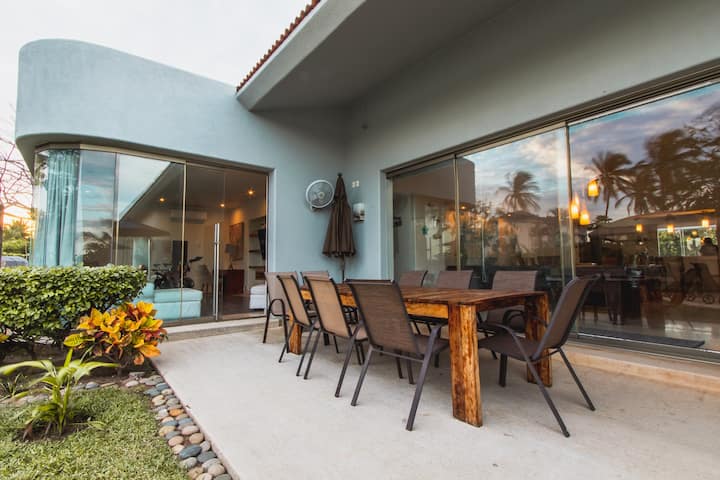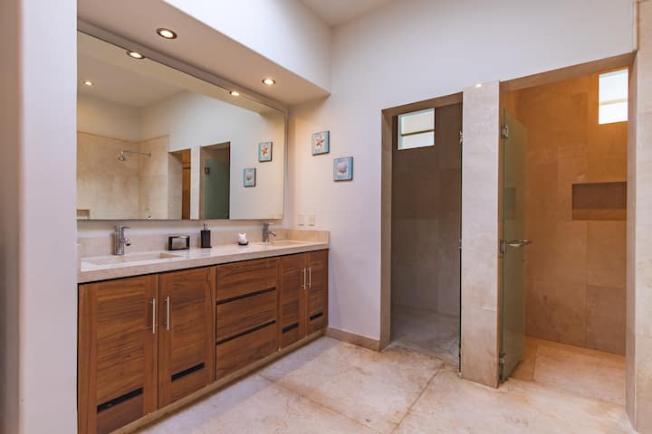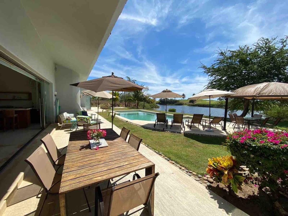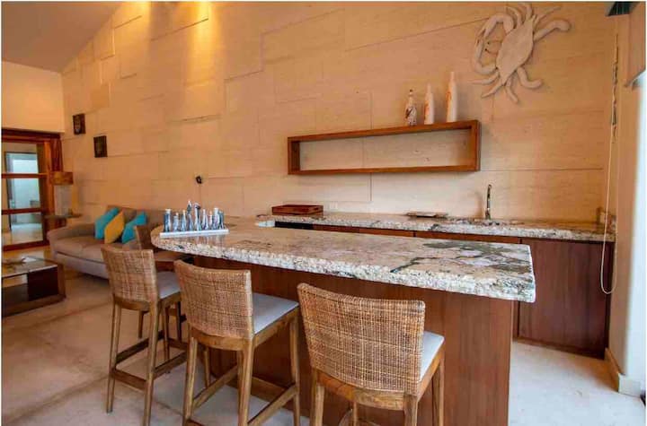 Es una exclusiva residencia de un solo nivel en un terreno de más de 2,000 m² con 1,200 m² de construcción, ideal para hasta 16 personas. Cuenta con alberca, amplias áreas exteriores y una atmósfera sofisticada y tranquila con vistas al lago y al campo de golf. Consta de 5 recámaras, sala de TV con cama adicional, y cada rincón está decorado con elegancia y comodidad. Ubicada en el fraccionamiento más exclusivo de la zona, ofrece seguridad, acceso al mar a pie en solo 10 minutos y espacios perfectos para ejercitarse al aire libre o correr en la playa. También incluye dos bicicletas para paseos. Se recomienda no acercarse ni alimentar a los reptiles del ecosistema local ni ingresar a los lagos interiores.